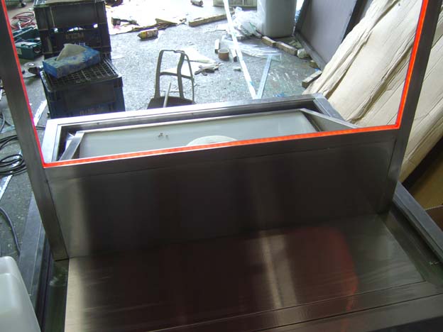 この「コ」の字型のステンレスレールの内部にLEDを仕込みました。写真では赤く見えますがオレンジ色のLEDです。と言ってもオレンジ色の割りに赤っぽかったですね。
