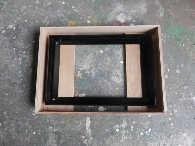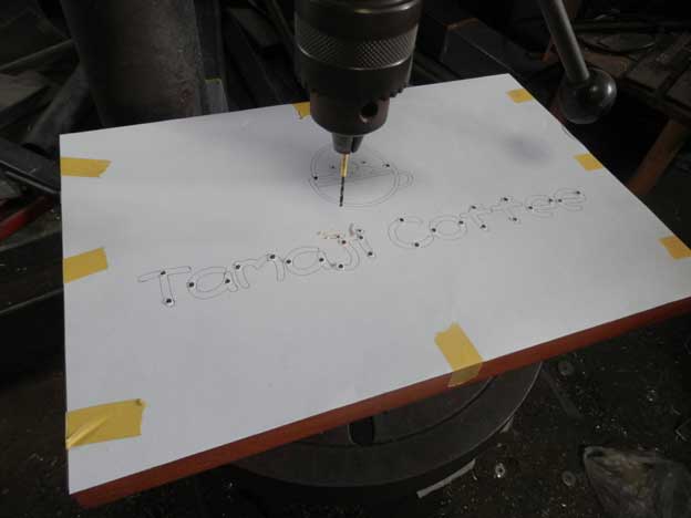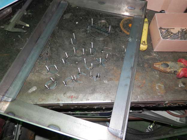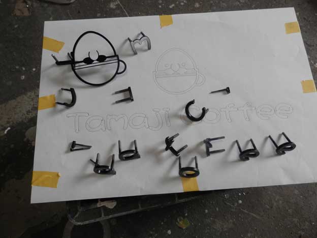フラットバーで額縁を組み、鉄板の切り抜き文字にスタッドを立てました。