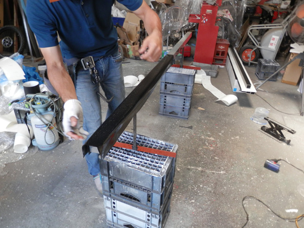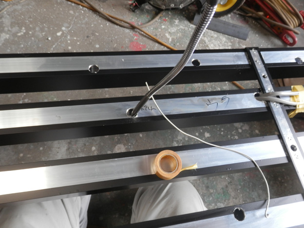 アルミの50角の角パイプの3面+折り返し分でプラスアルファ=実質4面・・・にシートを貼るため、ちょっとした治具を製作して作業しました。