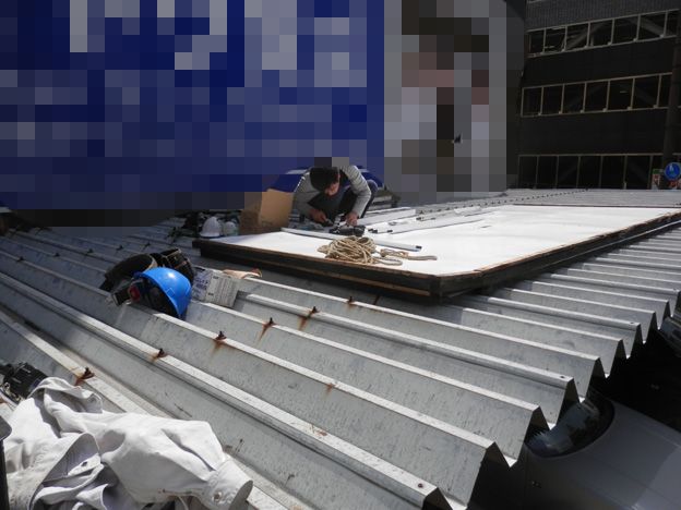 状況的にバケット車もユニック車も使えず、人力取り付けです。