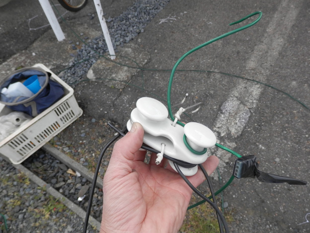DV線という電線を使うのが決まりですが、なんと!! ビニール巻きの針金を張り、キャブタイヤコードで飛ばしてありました!!