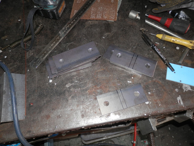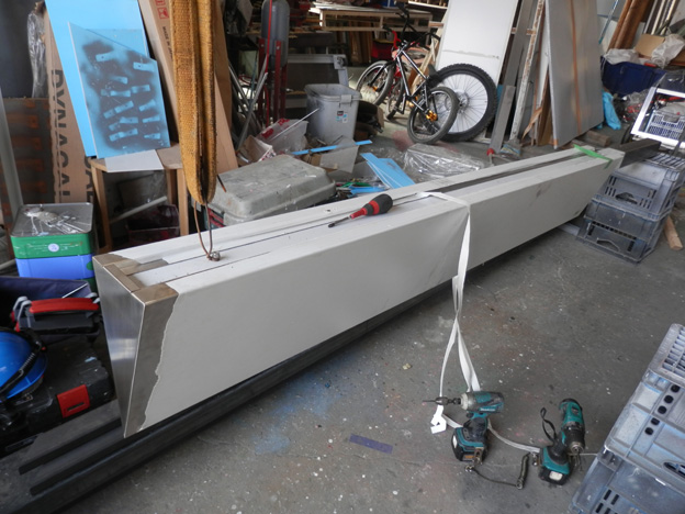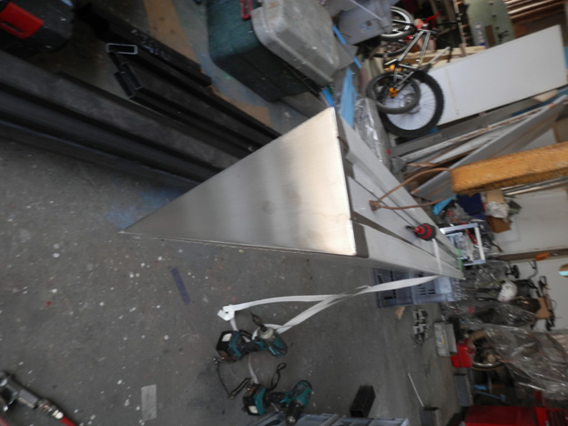 カオス状態の工場の中で、ステンレスの三角看板を製作。