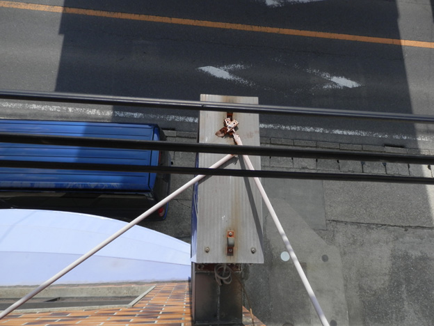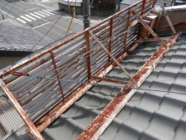 瓦屋根にドンと乗っけて、ワイヤーで吊っただけの設置方法にも驚きですが、サビサビです。