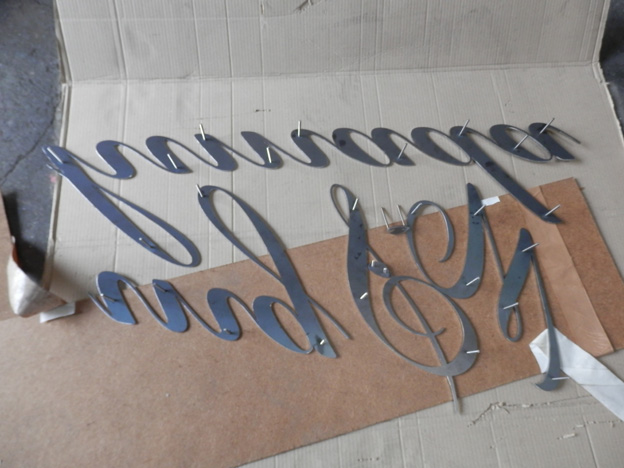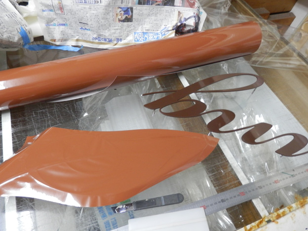 焼付け塗装から上がってきた鉄板の切文字は、正面に指定色のシートを貼りました。
