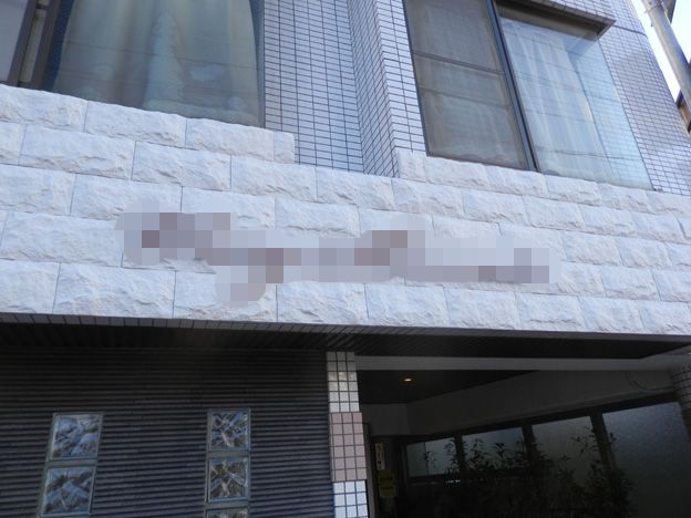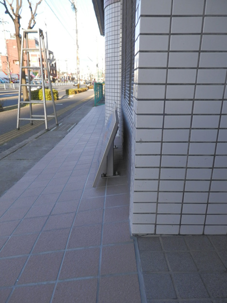 前後左右に傾斜したタイル張りの床に、面板が傾いた看板を製作&設置。