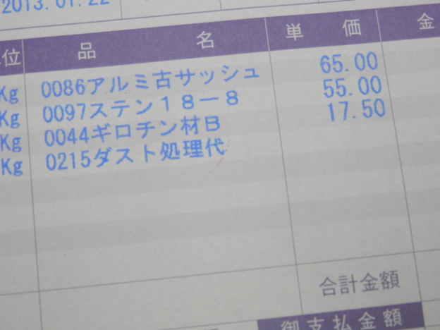 アルミサッシ¥65/kg、ステンレスが¥55/kgなので、最近としては良い部類かと。