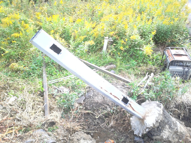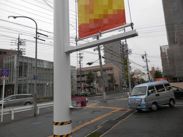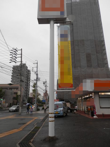 大型のポールサインの支柱に取り付けられた、簡易型の懸垂幕装置の移設作業です。