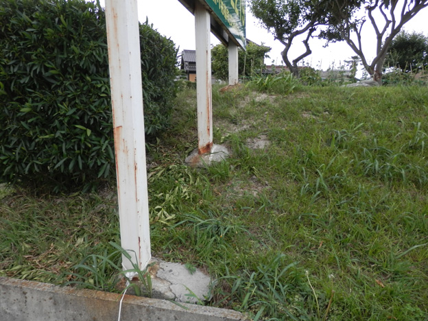 私の目には、状況的に看板にぶつけるようには見えないのですが、場内はあまり広くないので、通り抜け車両のすれ違い時にアルミバンのトラックか何かがぶつけたのでしょう。