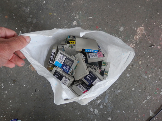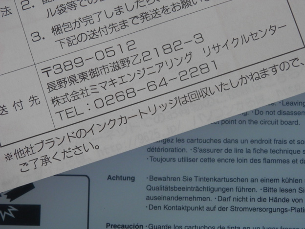 看板用のプリンターのインクカートリッジは、メーカーが無償で引き取ってくれます。宅急便の着払い伝票で送り返すのです。
