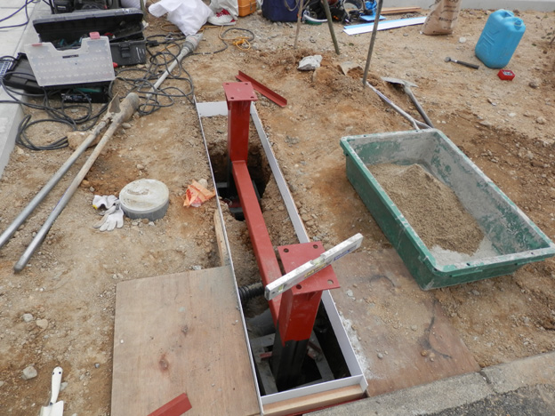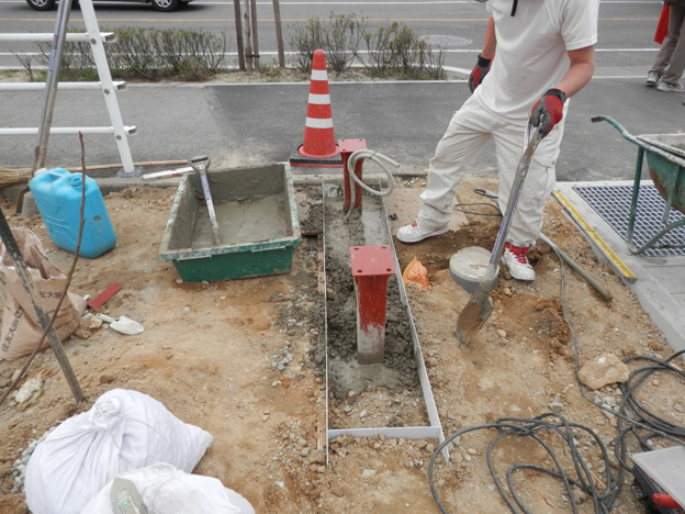 手練りでセメントをガンガン入れて行きます。型枠は得意のアルミ複合板(笑)。