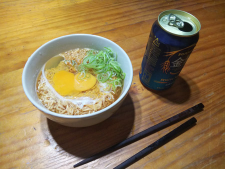 帰宅後もヘロッヘロで何もやる気が起きません。チキンラーメンを鍋で作る気すら起きず、お湯をかけただけです。最後の力を振り絞ってネギを刻み、玉子を割りいれました。手元が狂って黄身をつぶしてしまいました。