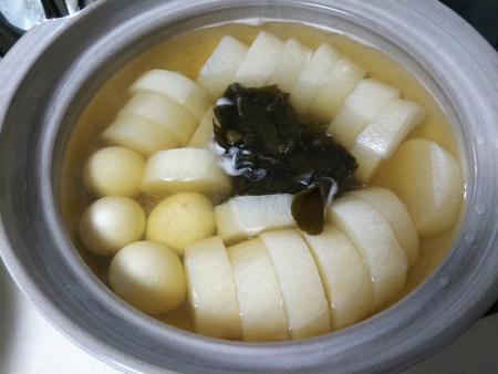 大根は米のとぎ汁で下茹でして、玉子とともに土鍋の出汁にドボン。