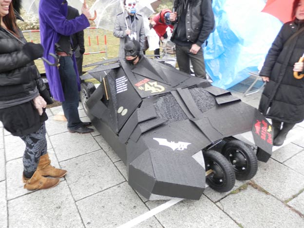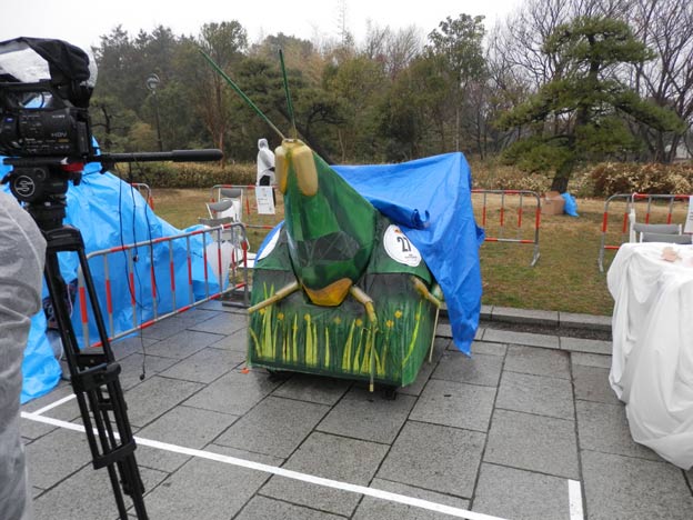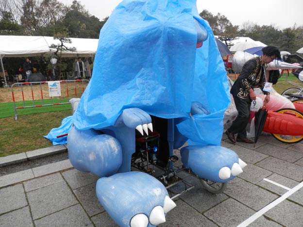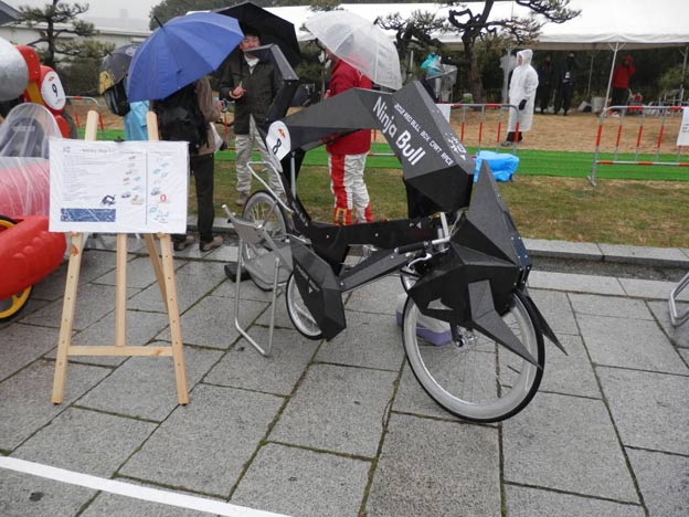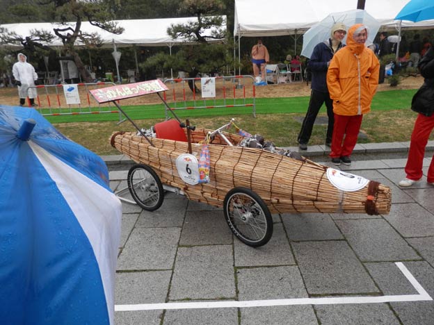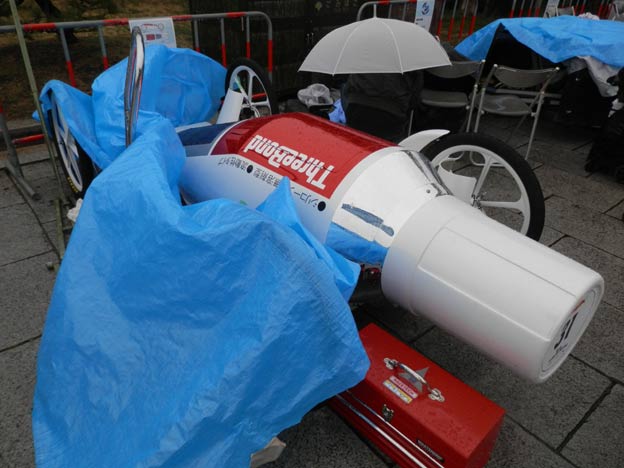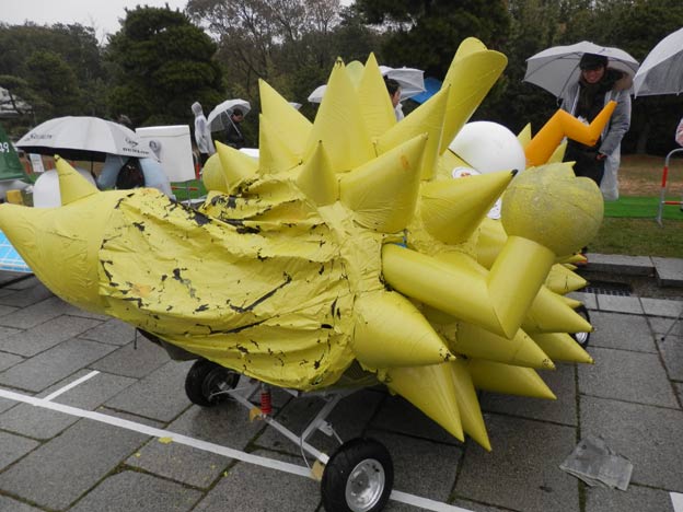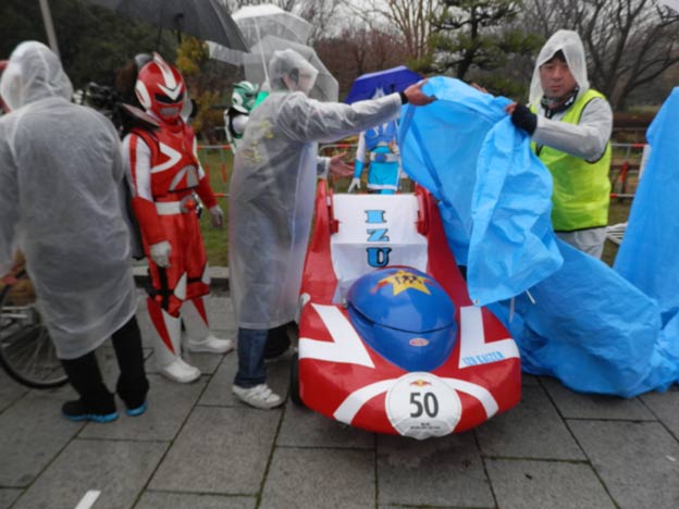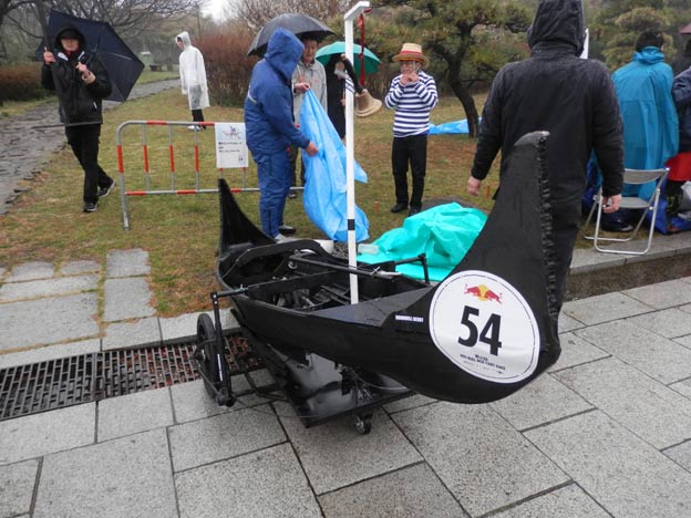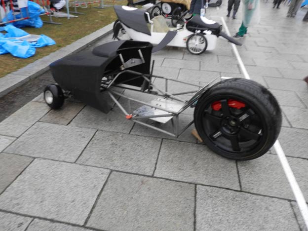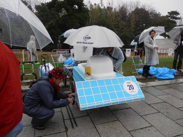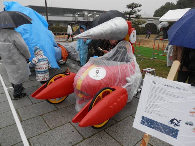 私が製作したカートは雨でも丸っきり平気なのですが(それどころか、タイヤなどの劣化を除けば、屋外で数年放置しても大丈夫、台風が来ても大丈夫!)、どうやら、紙やダンボールなどの濡れるとまずい素材を使っているチームもあるようです。